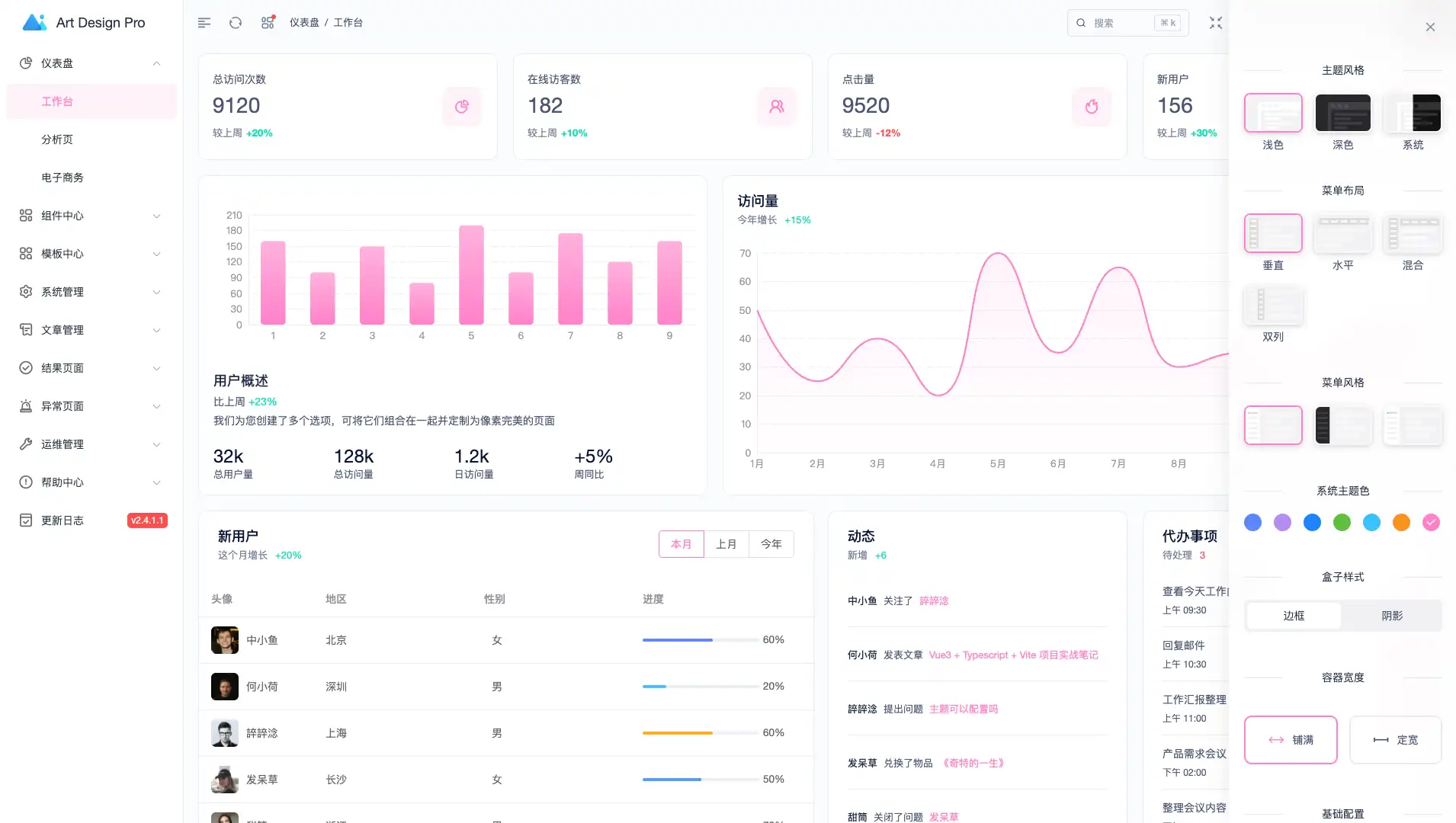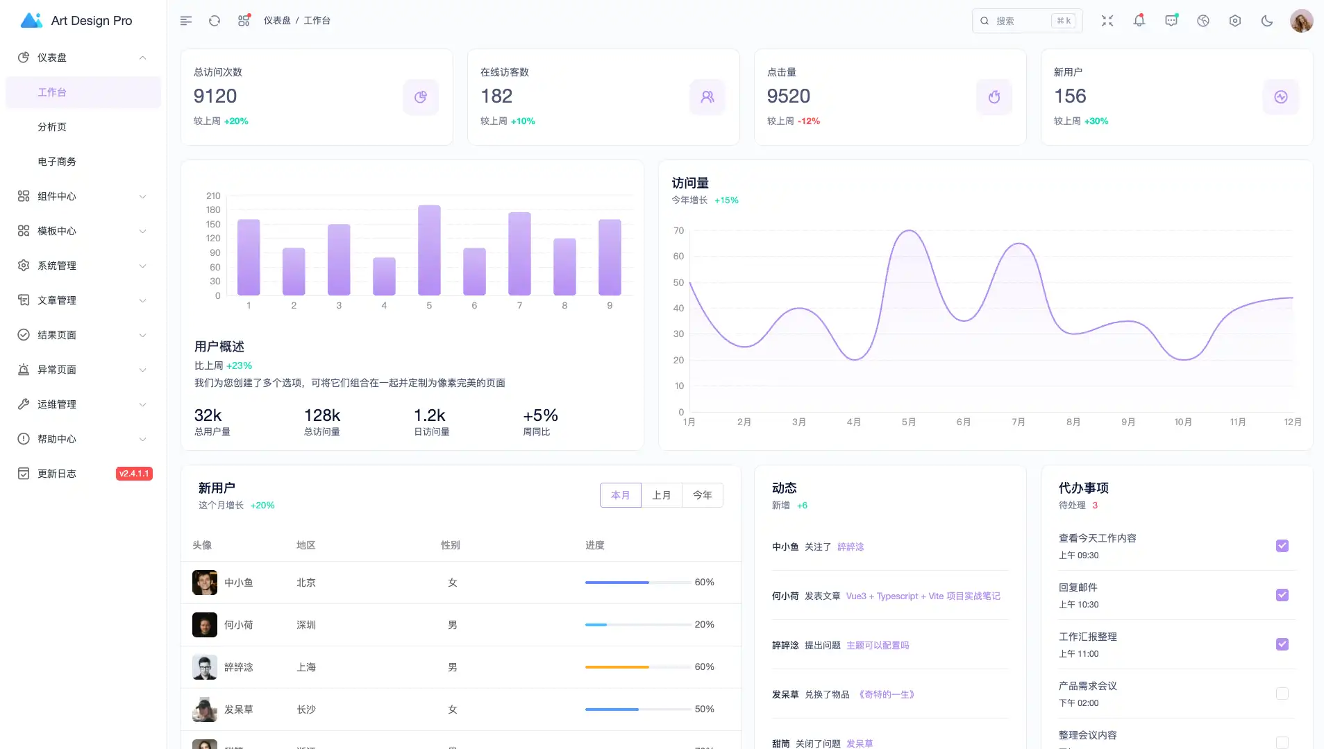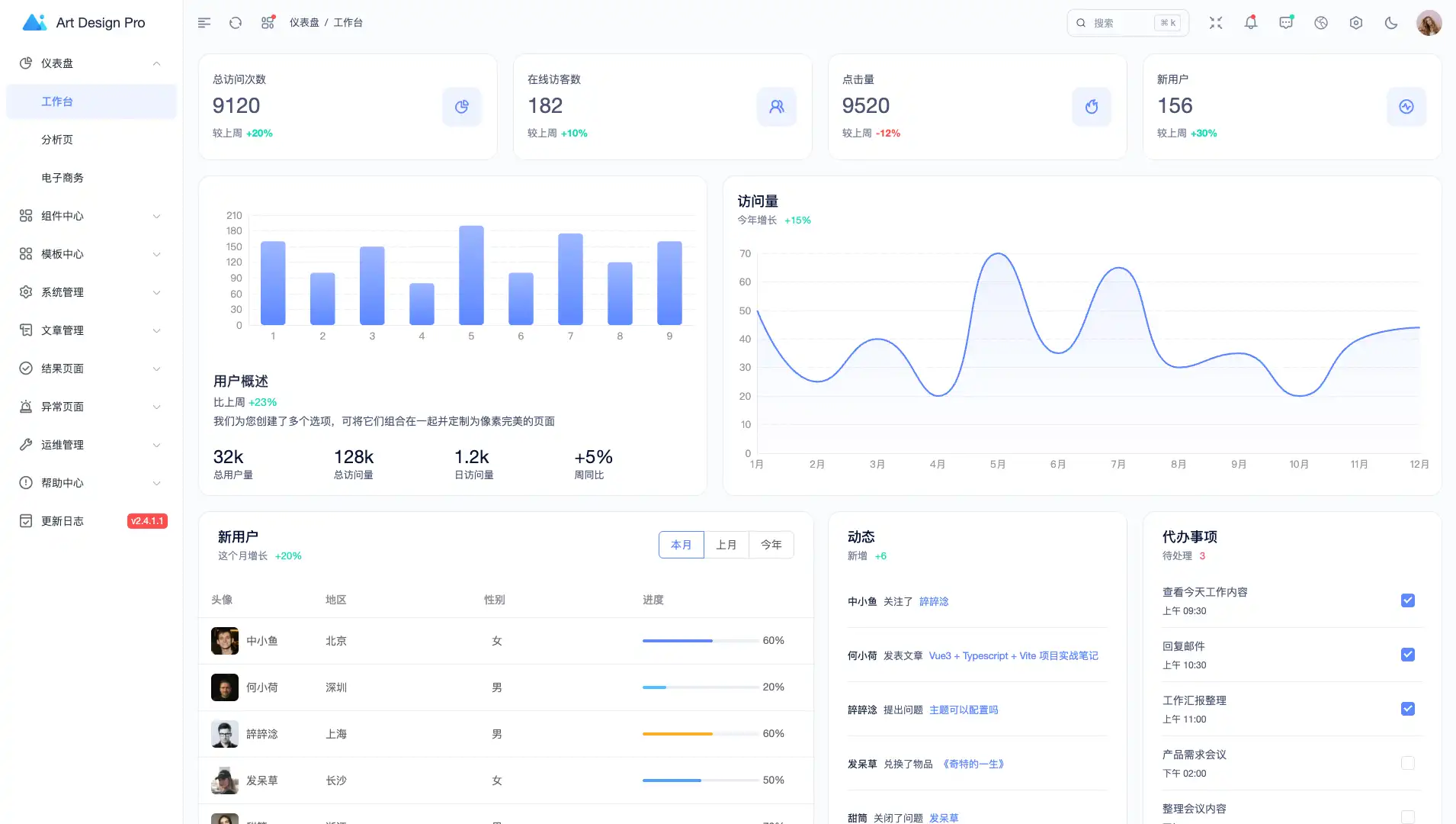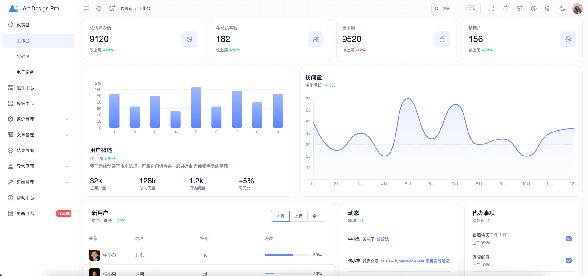 Art Design Pro is an open-source admin management solution focused on user experience and rapid development. Based on ElementPlus design specifications, it has been visually optimized to provide a more beautiful and practical frontend interface, helping you easily build high-quality admin systems.