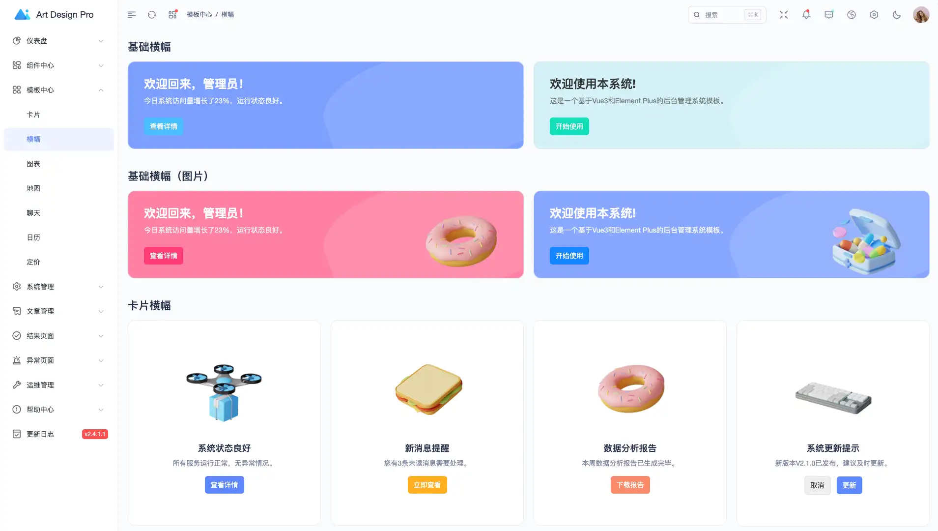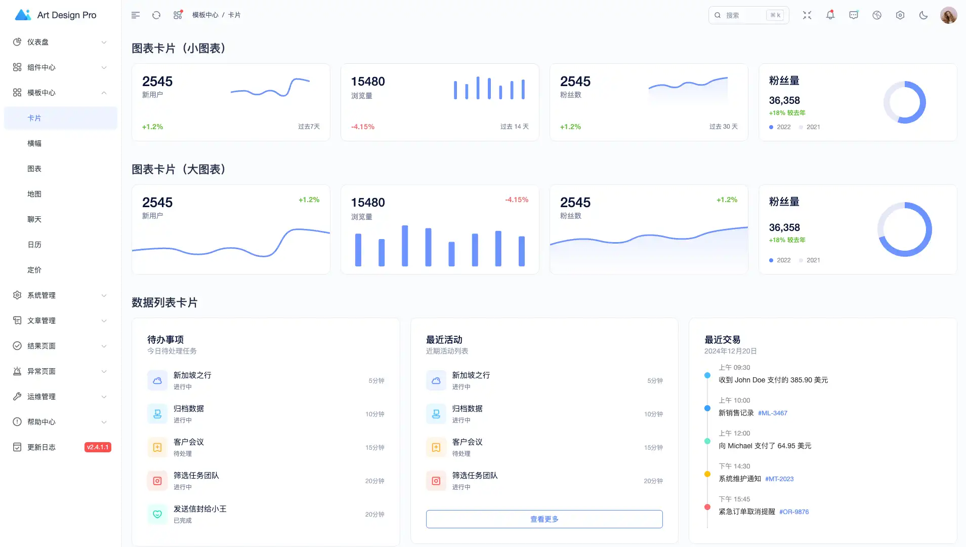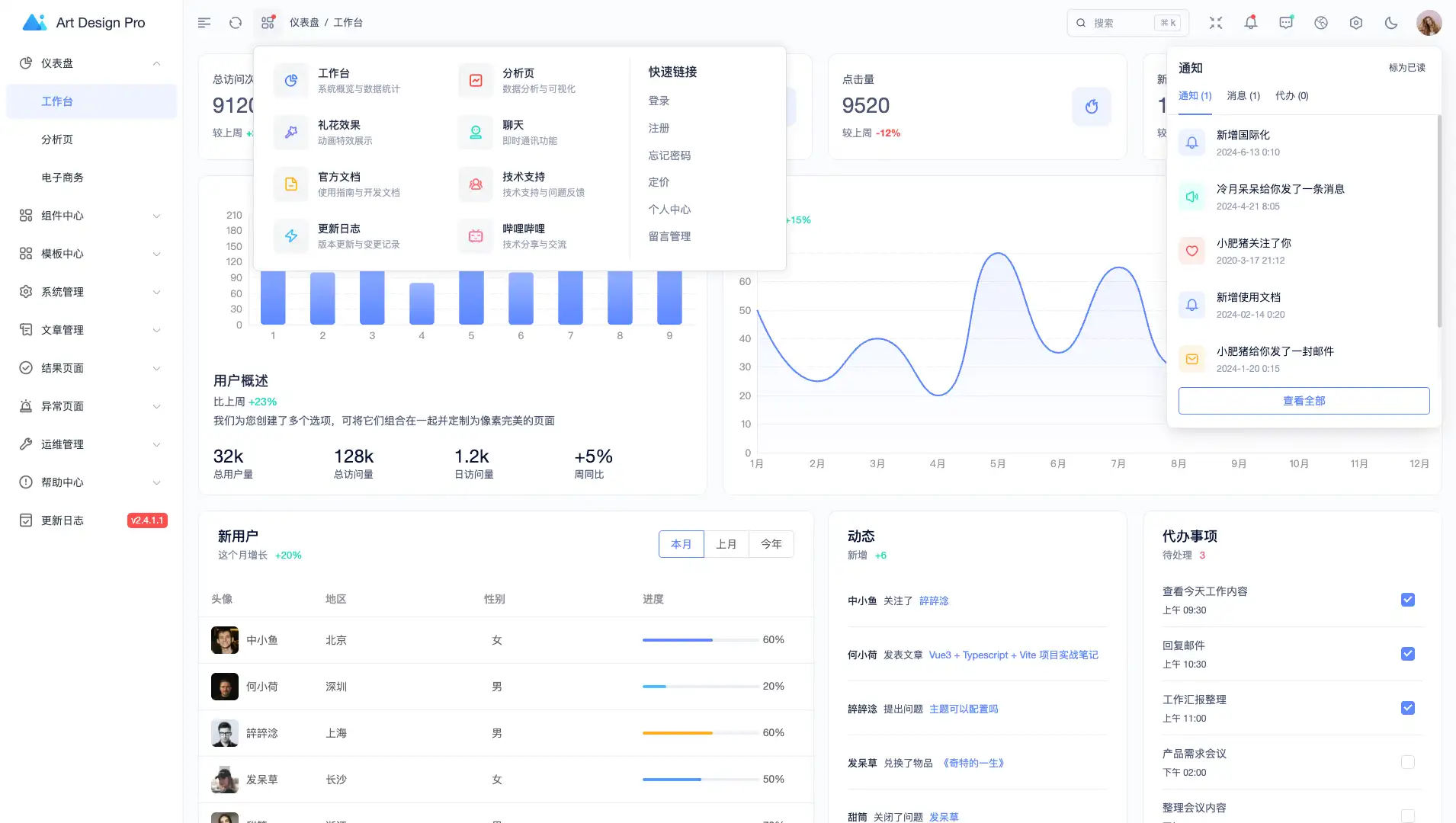 Art Design Pro is an open-source admin management solution focused on user experience and rapid development. Based on ElementPlus design specifications, it has been visually optimized to provide a more beautiful and practical frontend interface, helping you easily build high-quality admin systems.